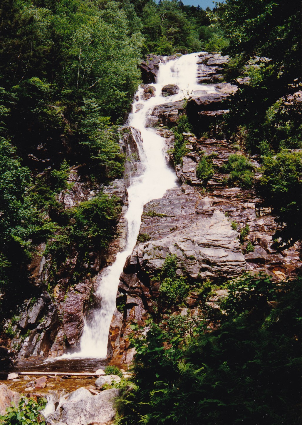 There had been an unusually large amount of rain in the region this summer, and so there was quite a bit of water pouring over the cascades. They were very beautiful. High up, the stream flowed over a wide rock in a graceful curtain. But the lower part of the falls crashed down a narrow crack in the rocks and exploded into the lower pool with intensity.